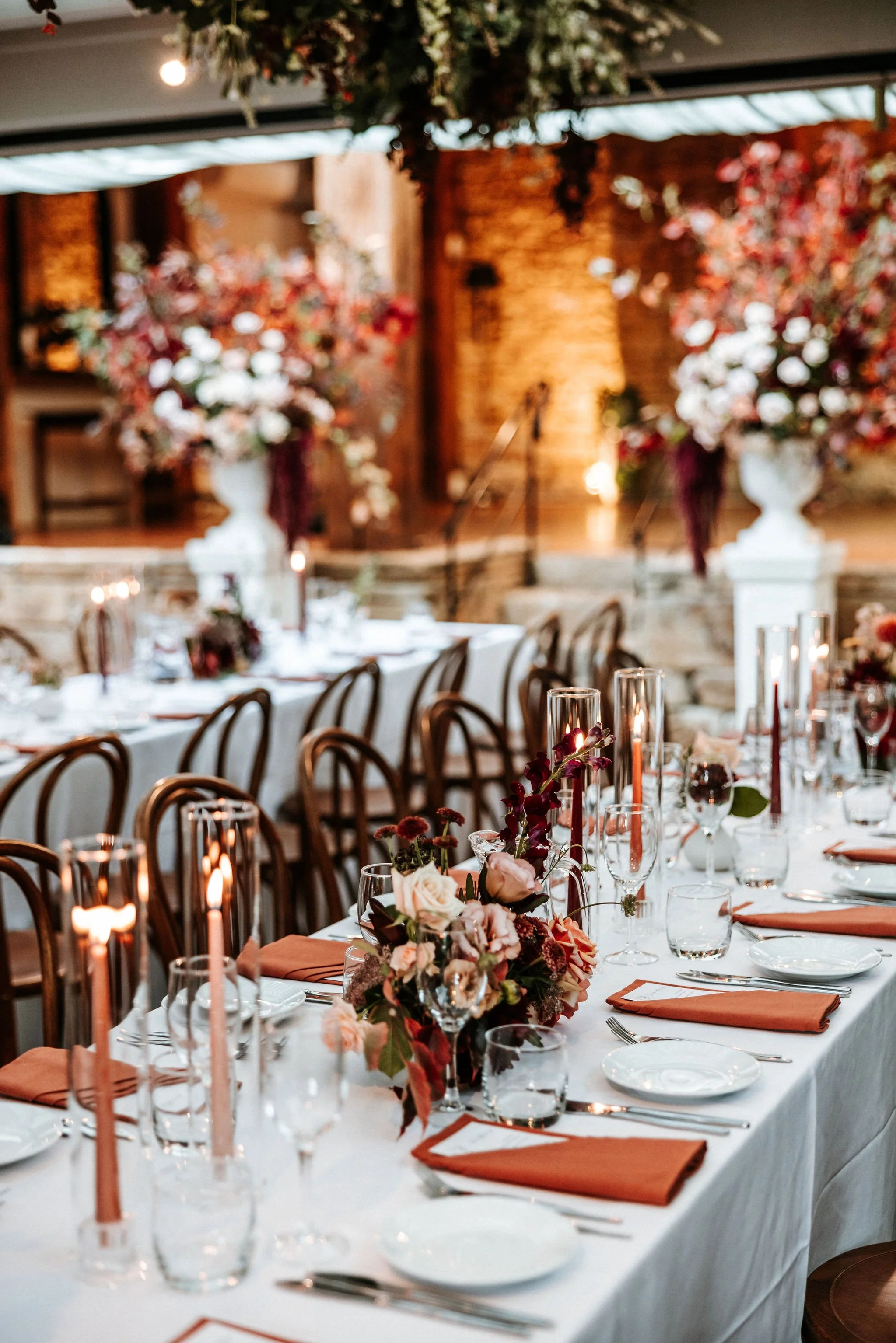 Following the ceremony, guests were treated to a personalised menu crafted by the Chef and I, in our lovely sandstone Conservatory. The tables, draped in crisp white linen, were adorned with more rust toned candles and fabric napkins creating a warm ambiance.
